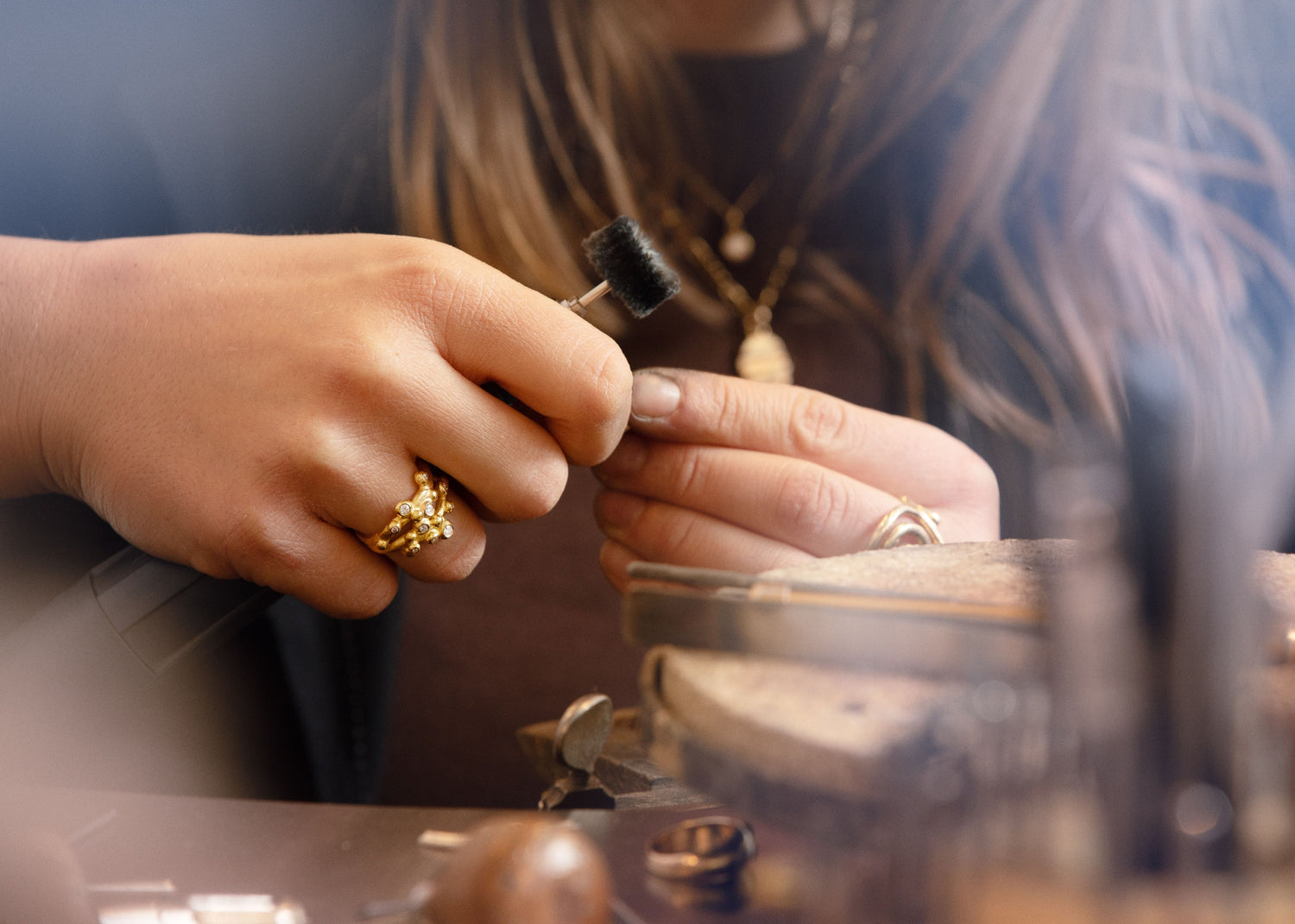Vigga er en særlig historie, for hun er andet og mere end en af mine guldsmede. Vigga er min ældste datter og har været med mig i butikken og på værkstedet i 25 år.
